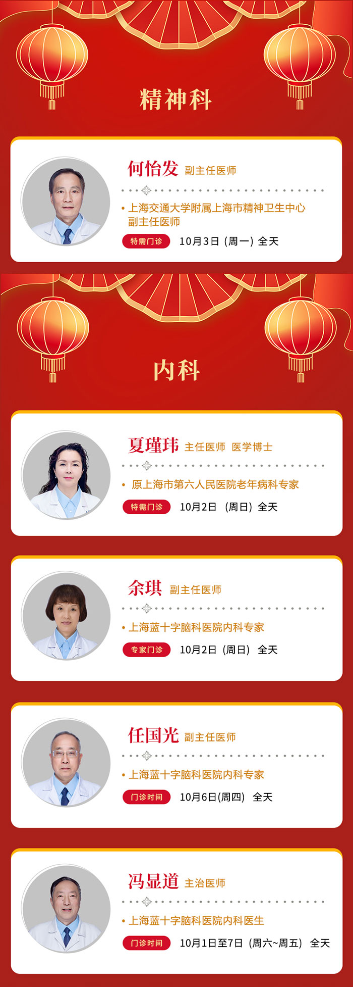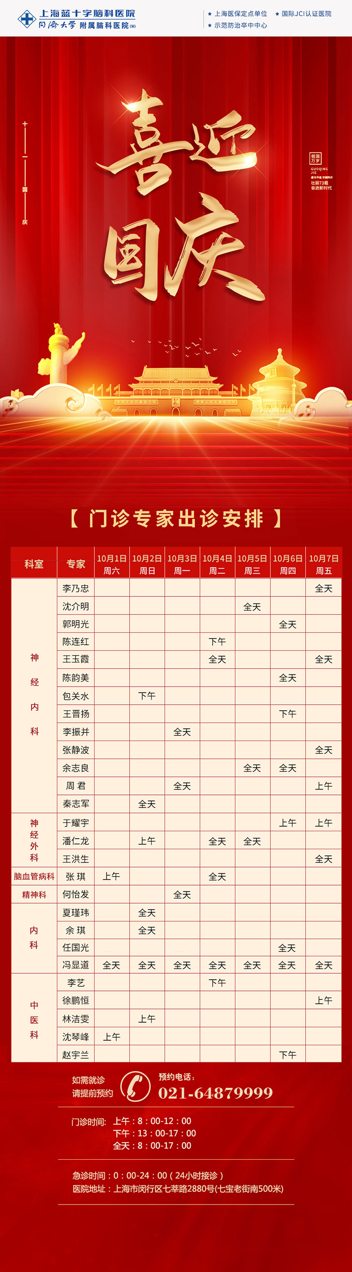 国庆将至,根据《国务院办公厅关于2022年部分节假日安排的通知》,在切实做好疫情防控工作的同时,为保障群众就医需求,我院门诊照常开放。望各位患友按照上海市疫情防控要求,提前规划行程,做好出行安排,尽量预约就诊。详细门诊安排如下: