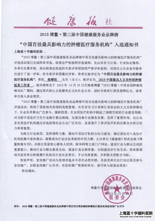 据悉,上海蓝十字脑科医院曾在2014年12月5日~8日召开的“2014博鳌·第二届中国健康服务业大会”上获得“中国医疗机构公信力示范单位”称号。2015年接近年尾,蓝十字脑科医院再度在博鳌·中国健康服务业论坛上斩获大奖,不仅体现出社会各界对蓝十字脑科医院出色的专家团队、诊疗技术、治疗水平以及在回馈社会、担当责任方面的肯定与鼓励,更体现出蓝十字脑科医院的精益求精、不断超越,上海蓝十字脑科医院在群众中的公信力和美誉度进一步提升。
