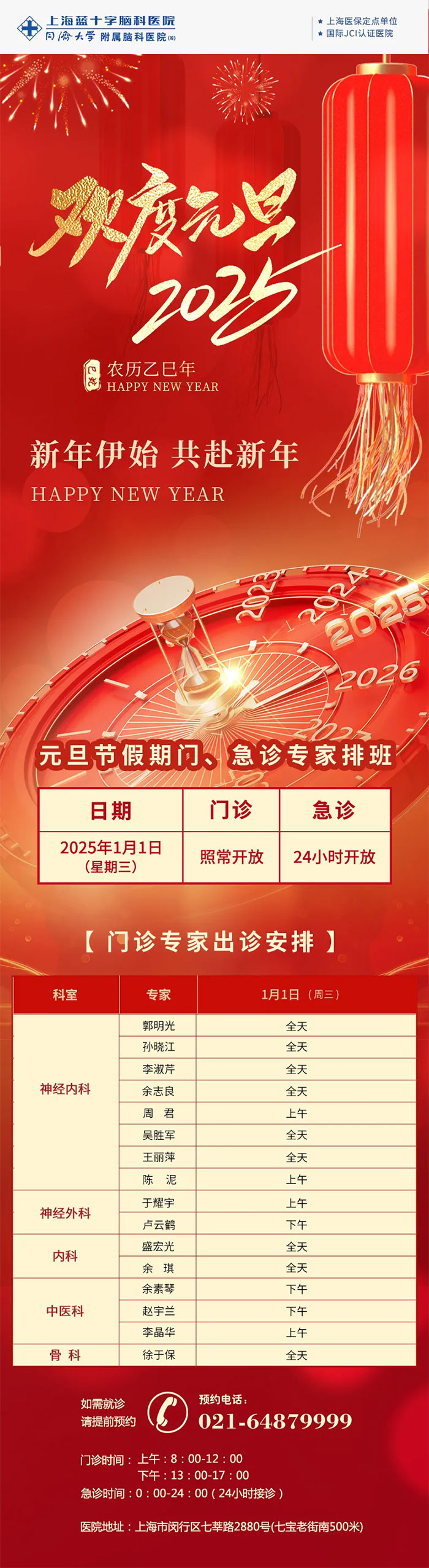 最后,上海蓝十字脑科医院全体医护人员恭祝广大市民朋友们——元旦快乐,阖家欢乐,幸福安康!