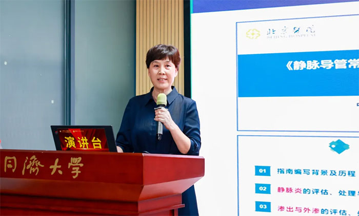 此次培训,钱火红总护士长以《中心静脉通路相关高风险并发症的识别、预防及处理》为主题进行授课分享,阐述了中心静脉通路的概念界定,并围绕静脉炎、渗出与外渗、血管通路装置堵塞、导管性感染、导管相关血栓形成、导管异位、导管相关性皮肤损伤、拔管困难等中心静脉通路常见的8个高风险并发症的识别、预防和处理进行了详细讲解。