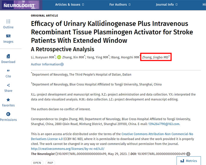 近期,美国《科学引文索引》(Science Citation Index,简称SCI)收录了上海蓝十字脑科医院神经内科7A病区主任张静波以通讯作者(课题负责人)身份在《NEUROLOGIST》期刊发表的题为“Efficacy of Urinary Kallidinogenase Plus Intravenous Recombinant Tissue Plasminogen Activator for Stroke Patients With Extended Window A Retrospective Analysis”(中文:尤瑞克林联合重组组织型纤溶酶原激活剂治疗扩展时间窗溶栓治疗卒中患者的疗效回顾性分析)的研究论文。