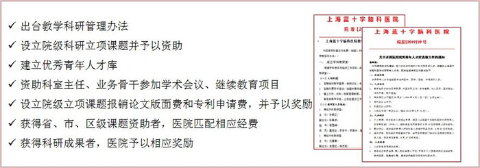 作为以“专家建院、技术立院、创新兴院”为发展方针,致力于创建现代化、国际化、专业化的脑科医院,上海蓝十字脑科医院始终重视学科建设和人才培养,先后设立学科建设专项基金,先后出台教学科研管理办法,设立院级科研立项课题、建立青年人才库等,为人才搭建成长平台,学术研究蔚然成风。