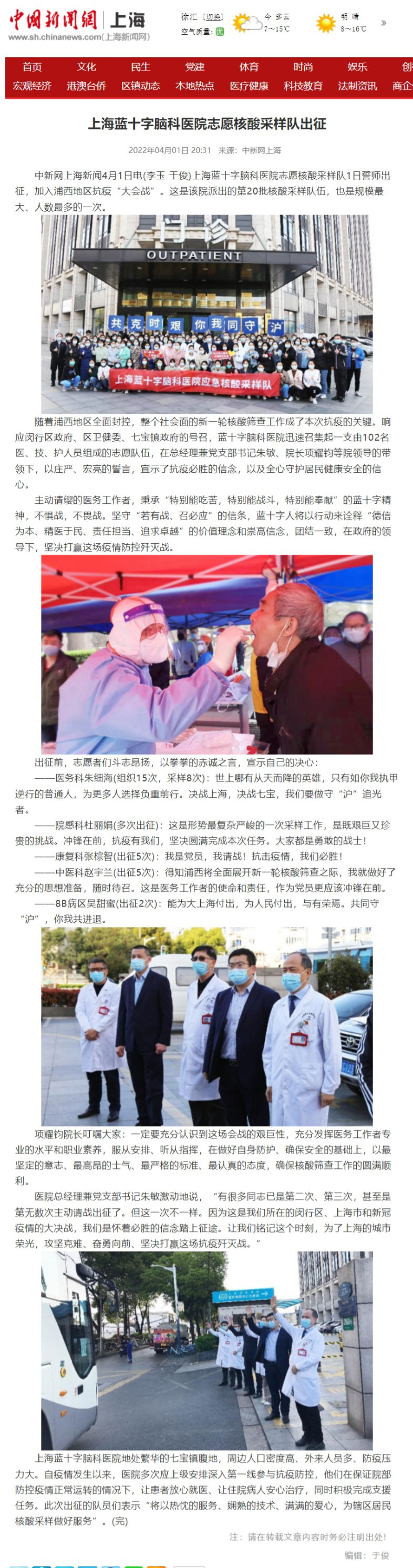中新网上海新闻4月1日电(李玉 于俊)上海蓝十字脑科医院志愿核酸采样队1日誓师出征,加入浦西地区抗疫“大会战”。这是该院派出的第20批核酸采样队伍,也是规模最大、人数最多的一次。