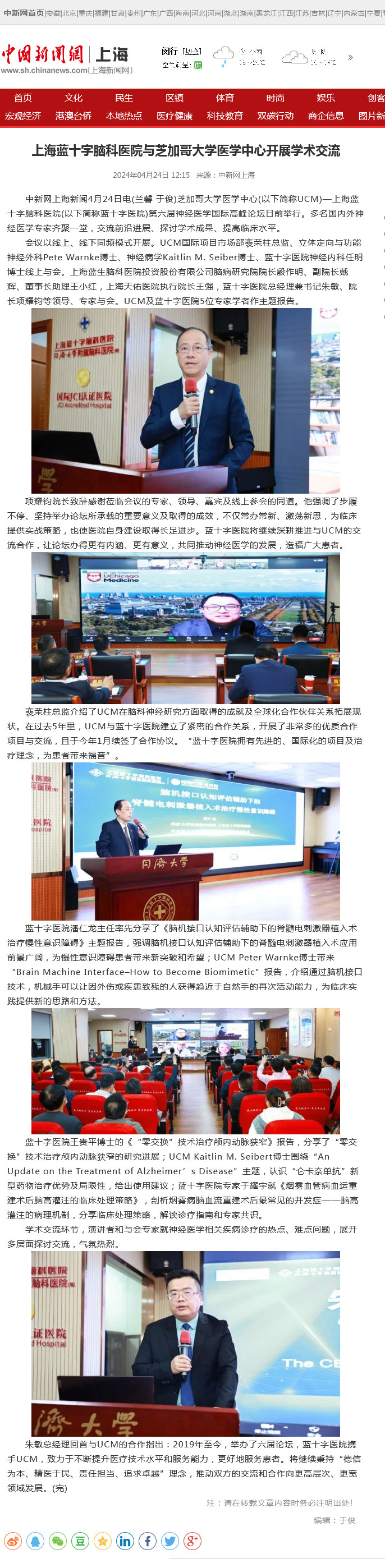 中新网上海新闻4月24日电(兰馨 于俊)芝加哥大学医学中心(以下简称UCM)—上海蓝十字脑科医院(以下简称蓝十字医院)第六届神经医学国际高峰论坛日前举行。多名国内外神经医学专家齐聚一堂,交流前沿进展、探讨学术成果、提高临床水平。