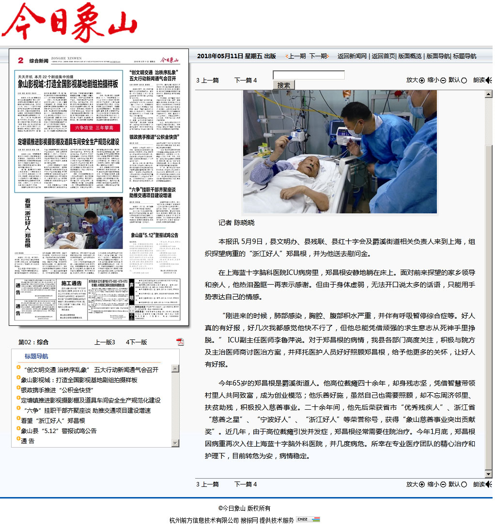 今年65岁的郑昌根是爵溪街道人。他高位截瘫四十余年,却身残志坚,凭借智慧带领村里人共同致富,成为创业模范;他乐善好施,虽然自己也需要照顾,却不忘周济邻里、扶贫助残,积极投入慈善事业。二十余年间,他先后荣获省市“优秀残疾人”、浙江省“慈善之星”、“宁波好人”、“浙江好人”等荣誉称号,获得“象山慈善事业突出贡献奖”。近几年,由于高位截瘫引发并发症,郑昌根经常需要住院治疗。今年1月底,郑昌根因病重再次入住上海蓝十字脑外科医院,并几度病危。所幸在专业医疗团队的精心治疗和护理下,目前转危为安,病情稳定。