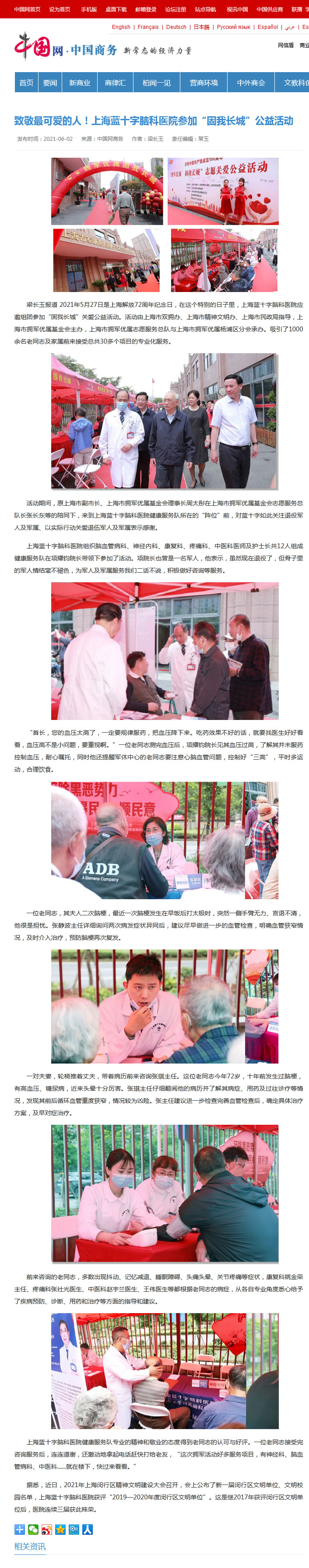 梁长玉报道 2021年5月27日是上海解放72周年纪念日,在这个特别的日子里,上海蓝十字脑科医院应邀组团参加“固我长城”关爱公益活动。活动由上海市双拥办、上海市精神文明办、上海市民政局指导,上海市拥军优属基金会主办,上海市拥军优属志愿服务总队与上海市拥军优属杨浦区分会承办。吸引了1000余名老同志及家属前来接受总共30多个项目的专业化服务。