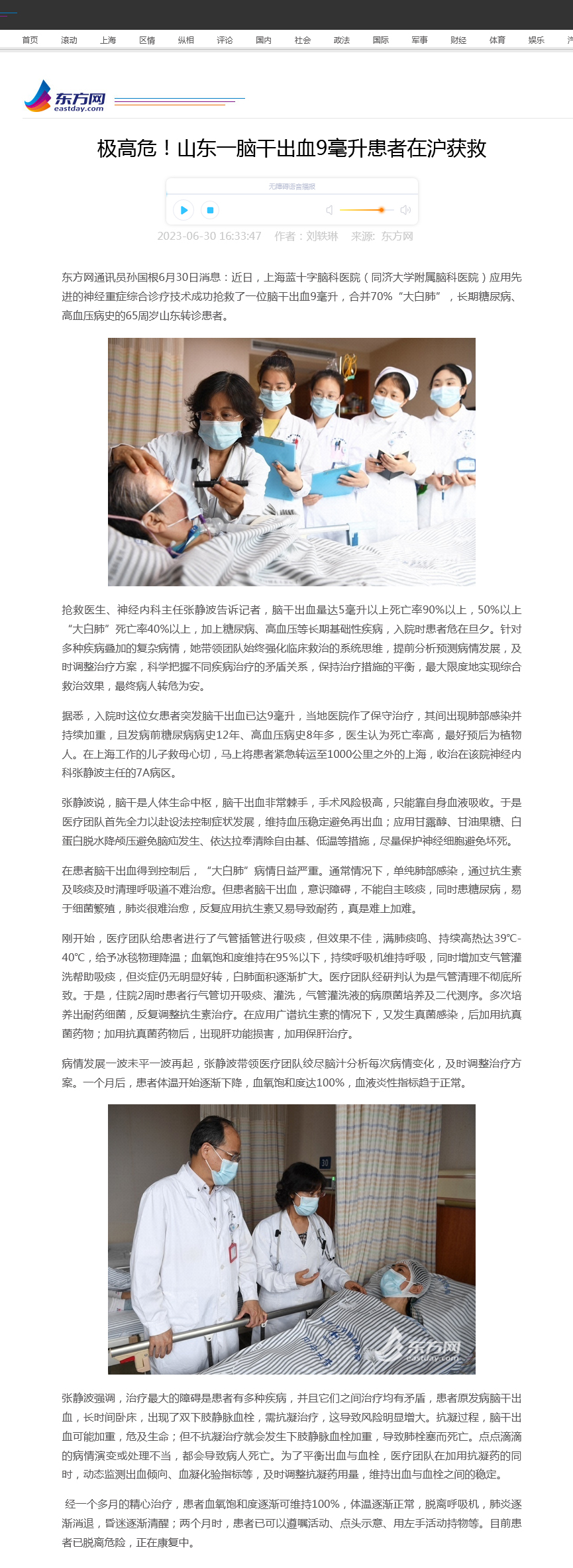 东方网通讯员孙国根6月30日消息:近日,上海蓝十字脑科医院应用先进的神经重症综合诊疗技术成功抢救了一位脑干出血9毫升,合并70%“大白肺”,长期糖尿病、高血压病史的65周岁山东转诊患者。