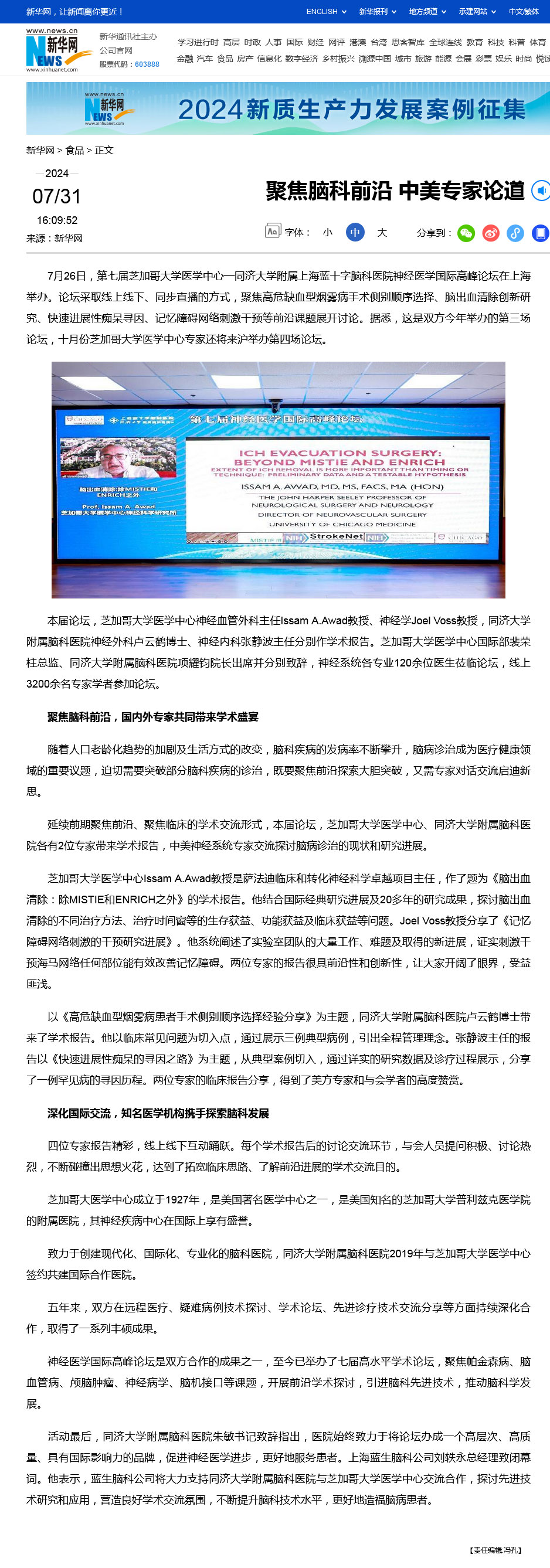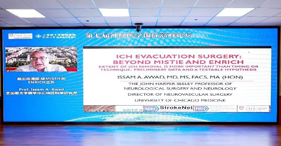 本届论坛,芝加哥大学医学中心神经血管外科主任Issam A.Awad教授、神经学Joel Voss教授,同济大学附属脑科医院经外科卢云鹤博士、神经内科张静波主任分别作学术报告。芝加哥大学医学中心国际部裴荣柱总监、同济大学附属脑科医院项耀钧院长出席并分别致辞,神经系统各专业120余位医生莅临论坛,线上3200余名专家学者参加论坛。
