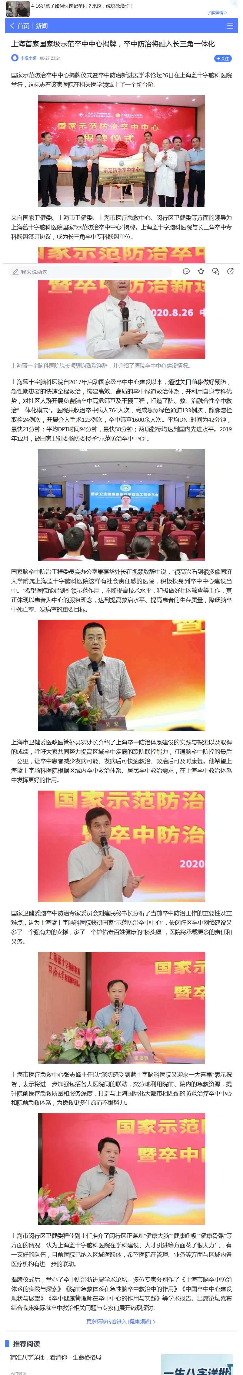 来自国家卫健委、上海市卫健委、上海市医疗急救中心、闵行区卫健委等方面的领导为上海蓝十字脑科医院国家“示范防治卒中中心”揭牌。上海蓝十字脑科医院与长三角卒中专科联盟签订协议,成为长三角卒中专科联盟单位。