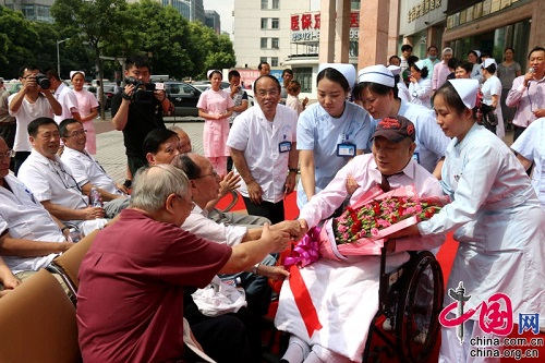 郑昌根在蓝十字脑科医院工作人员护送下正式出院返乡