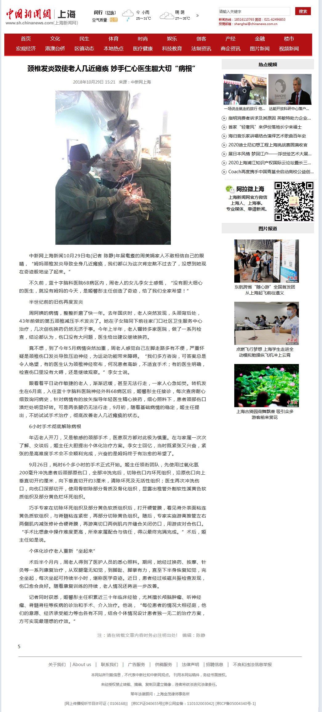 竟不想,到了今年5月病情突然加重,周老人感觉自己左脚走路多有不便,严重怀疑是颈椎伤口发炎导致压迫神经,为运动功能带来障碍。“我们多方咨询,可答案总是令人绝望,有的医生认为颈椎神经密布,何况患者高龄,不适宜手术;有的医生明确,检查伤口里没有大碍,还是继续观察。”李女士说。