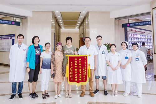 沈建康教授精湛的医术吸引了很多患者慕名而来,其中就包括了女排教练唐女士。唐女士患面肌痉挛疾病多年,辗转了多家医院,治疗效果也不明显,最后,转入上海蓝十字医院找到沈建康教授寻求治疗,沈教授为唐女士行“左侧面神经微血管减压术”,术后唐女士面部抽搐症状立即消失,面肌痉挛疾病得以成功治疗。为此,周鹿敏专程赴蓝十字医院送上锦旗表示感谢。