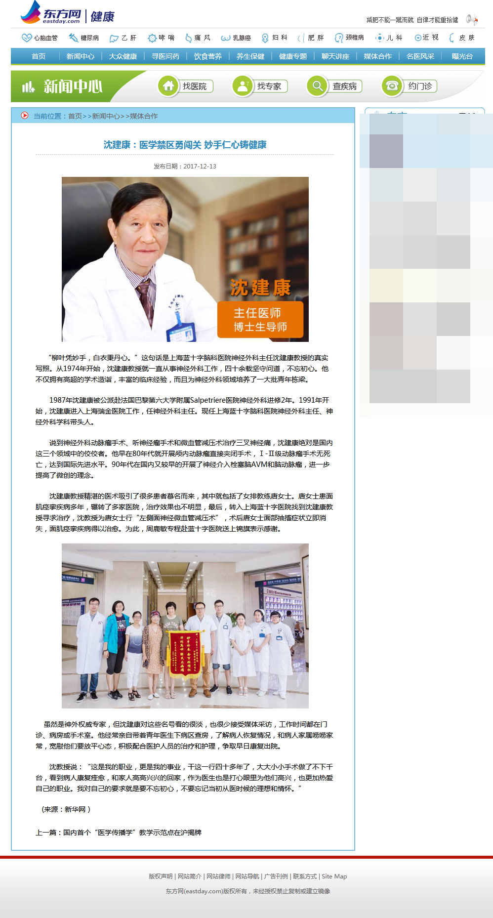 1987年沈建康被公派赴法国巴黎第六大学附属Salpetriere医院神经外科进修2年。1991年开始,沈建康进入上海瑞金医院工作,任神经外科主任。现任上海蓝十字脑科医院神经外科主任、神经外科学科带头人。