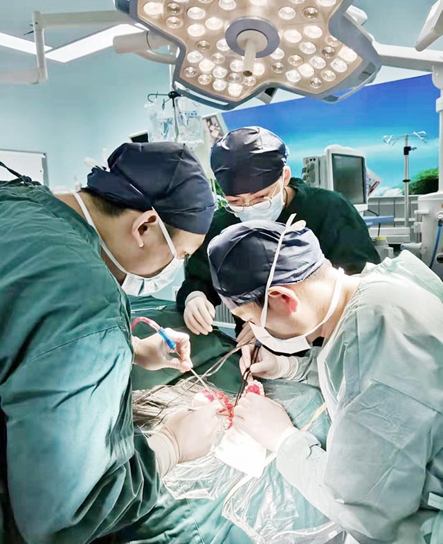 ▲刘春医生(左一)与张琪博士在手术中(资料图)