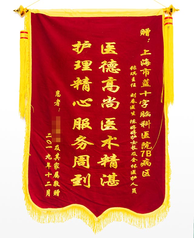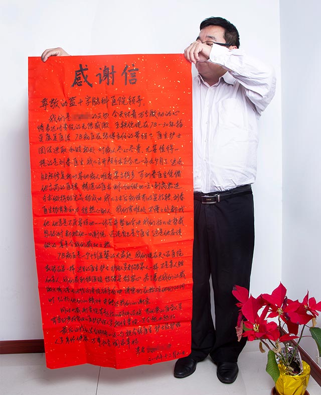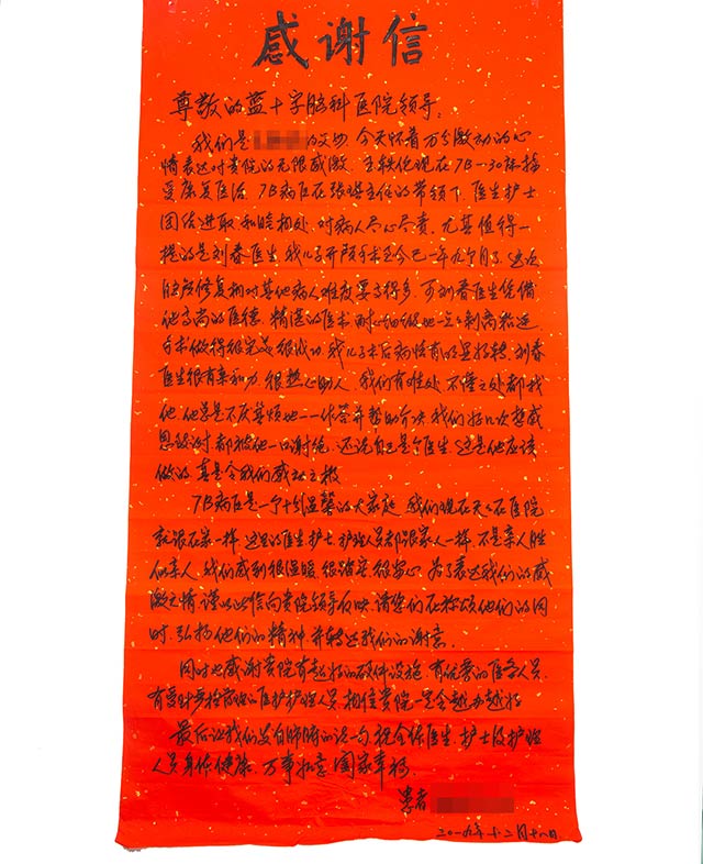 “尊敬的蓝十字脑科医院领导,我们是xxx的父母,今天怀着万分激动的心情表达对贵院的无限感激……”近日,上海蓝十字脑科医院行政办公室收到一封特殊的感谢信,这封信是用硬笔写在一张成人大小的大红纸上,宛如一幅大红喜报。