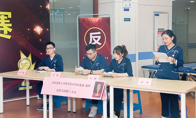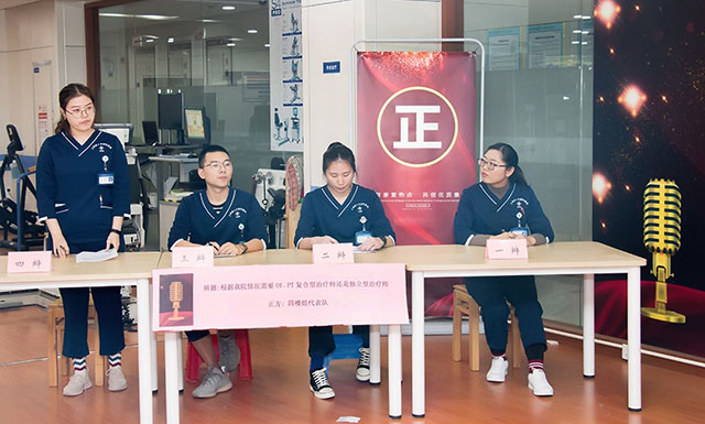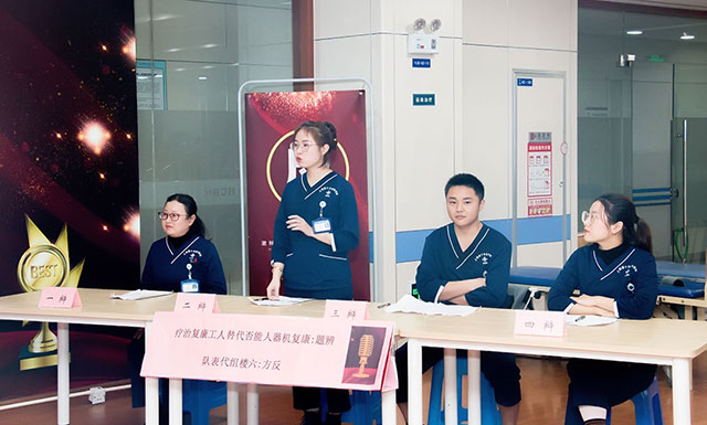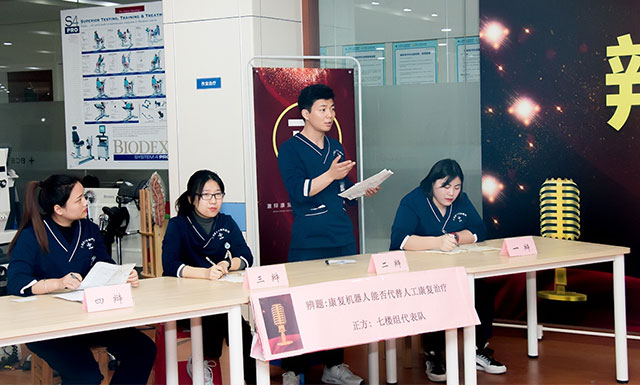 本次辩论赛主要分为三组,共6个代表队(三个正方和三个反方)参加,主要围绕康复医学的三个热点议题——1.康复机器人能否代替人工康复治疗;2.康复医学科是否要设立康复病房;3.根据我院情况需要OT、PT复合型治疗师还是独立型治疗师,展开激烈的角逐。