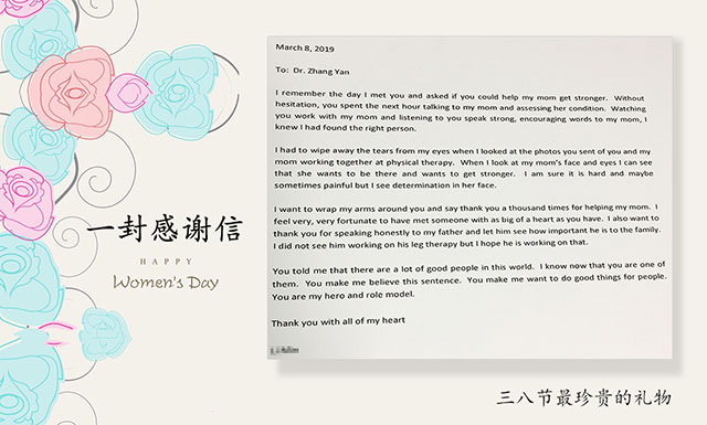 针对患者的病情,康复科主任姚金荣和程安龙教授制定了全面详细的康复治疗方案,经过康复技师两个多月的专业治疗和精心护理,患者情况明显好转。在语言方面,他已经能够说一些简单的词语,如“你好、谢谢、我很开心”等;手功能也得到了一定的恢复,不仅可以拿笔,还可以写字。他恢复了写字功能后,做的第一件事竟是给康复科的技师们写了三封感谢信,以表谢意。之后,他人也开朗不少,会主动和别人打招呼,尤其见到康复科的治疗师们,他会露出灿烂的笑容。