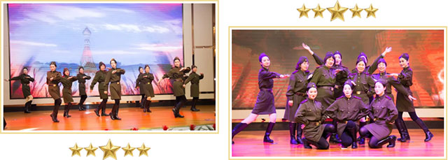 澎湃演绎由门急诊和客服部选送的《喀秋莎》舞蹈,她们一身穿着二战时期红军便服,头戴船形帽,脚蹬长筒靴,激情演绎,又一次令全场鼓掌欢呼。