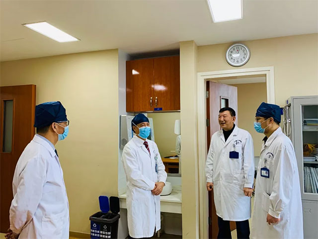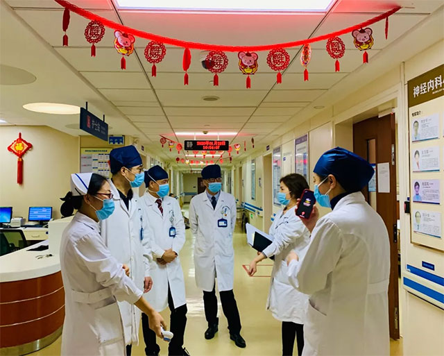 正月初四上午,项耀钧院长及郭俊艳副院长、苏顺吉副总等领导开完了早交会,就兵分两路,一路由项院长带队去各科室查房,一路由郭俊艳副院长去一楼急诊科检查门口“谢绝探访”等防疫工作情况。