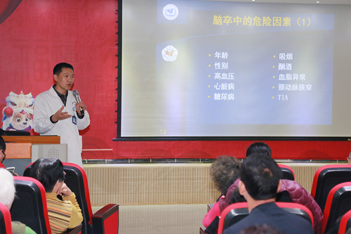 随后,我院神经内科7病区主任为居民们献上健康福利,开展了《脑血管病的科学防治之一级预防》健康讲座。余主任强调,脑血管病虽然高发,却是可防可治,关键是提早预防,对病发因素如“三高”(高血压、高血脂、高血糖)、吸烟酗酒等不良生活习惯、肥胖等进行有效干预。最后,他还给出十二字建议:“控制饮食、增加运动、定期体检、早期介入”。