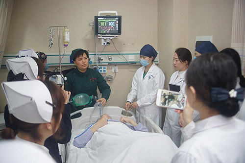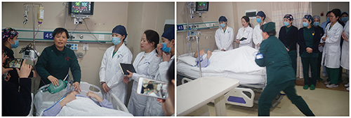 ▲潘水云护士长演示培训《危重患者抢救应急预案》