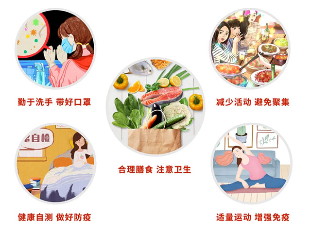 d、合理膳食,注意卫生:春节期间饮食无规律,运动又少容易发胖,因此大家要合理膳食,荤素搭配,少吃多餐;同时要注意饮食卫生,倡导公筷公勺,最好食用煮熟的食物,到正规超市和市场购买食材,尽量避免手部直接接触冷冻食品,且放冰箱时要严格包装,避免互相污染。