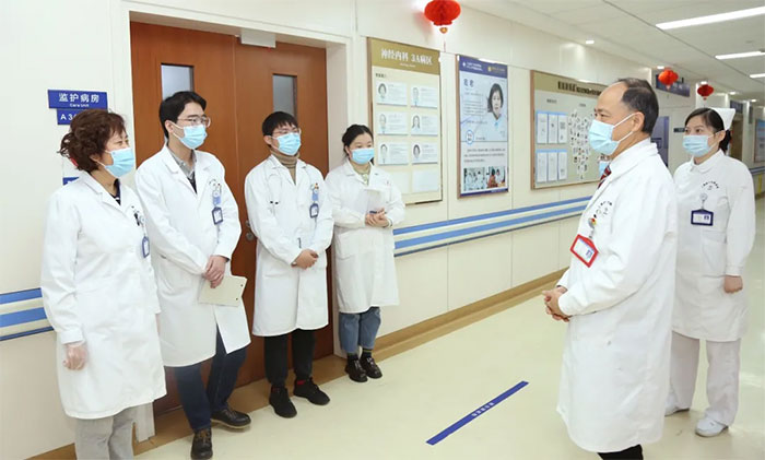 神经外科6B病区,春节期间收治重症患者5人,其中一位脑干出血患者转神经外科重症监护病房。科室潘仁龙主任每天坚持查房,并密切关注脑干出血患者,改进治疗方案,使该患者病情逐步稳定。