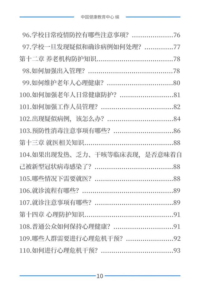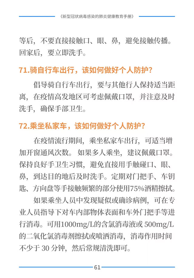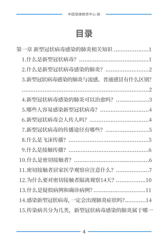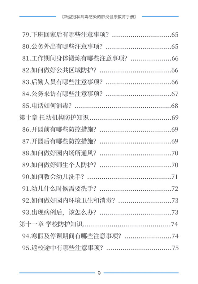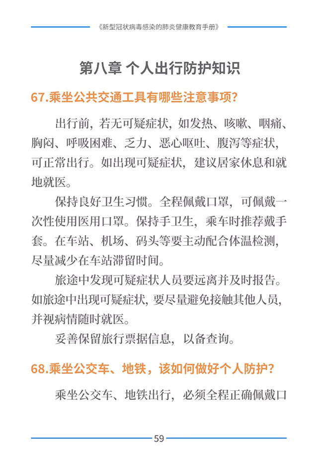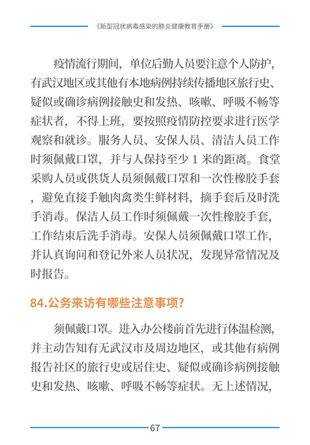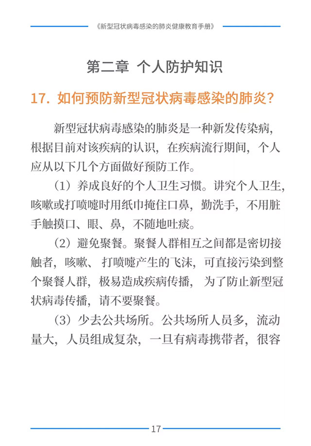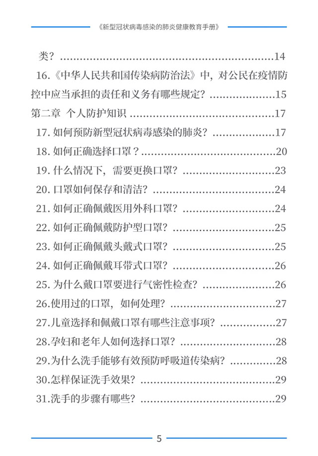 该手册共分为十五章,涉及相关知识、个人防护、重点人群防护、居家防护和消毒、出行防护、重点场所防护、就医防护、心理防护及健康生活方式等方面的114个问题,供广大公众和各级专业机构参考使用。