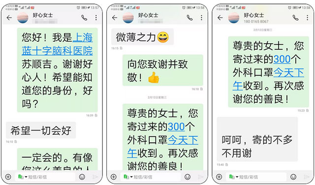 苏总特意用短信回复了这位爱心女士说,收到了300个外科口罩,并询问其身份要表示感谢;可是她只是表示“呵呵,寄的不多,不用谢”“微薄之力”、“希望一切会好”等。