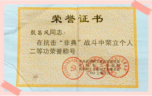 2003年,SARS在广东、北京肆虐,殷昌凤医生在武汉,为抗击SARS奋战了两个多月,荣获武钢职工总医院颁发的“个人二等功荣誉称号”。