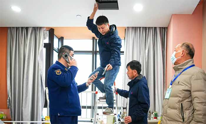 随后,检查组来到消防控制室,全面查阅医院消防安全管理制度、消控人员持证上岗情况、日常值班记录及消防演练台账等,逐项核对制度落实情况。检查组还深入医院楼顶平台、10F综合内科、8A神经内六科等重点区域进行现场勘察,测试火灾自动报警系统与自动喷水灭火系统的运行状态,随机抽查室内消火栓水压、灭火器配备情况及有效期,仔细检查疏散通道、安全出口是否畅通,应急照明灯、疏散指示标志等是否完好有效。