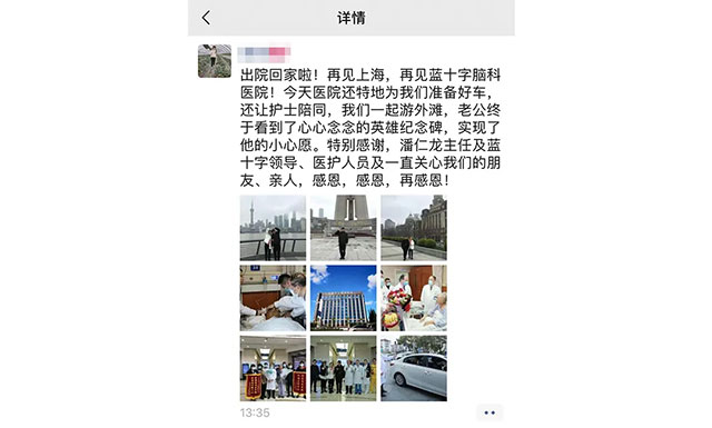 小莫夫妇及家属对潘主任及蓝十字医护人员的全力救治由衷地表示感谢。妻子冯凰芬说,小莫当时病情危急,只要一丝希望她也绝不会放弃,当他被转院到上海蓝十脑科医院,眼见丈夫病情一天天好转,最终恢复常态,完完整整地出院回家,“这多亏潘主任及医护人员辛勤付出!”小冯有点哽咽了。