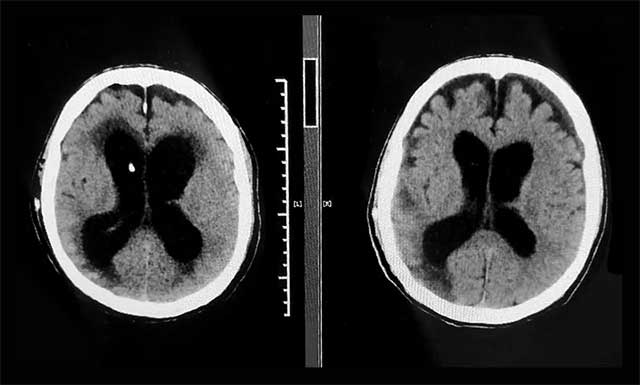 ▲ 术前(左)和出院前(右)CT比对,患者原先扩张的脑室已缩小,症状改善明显