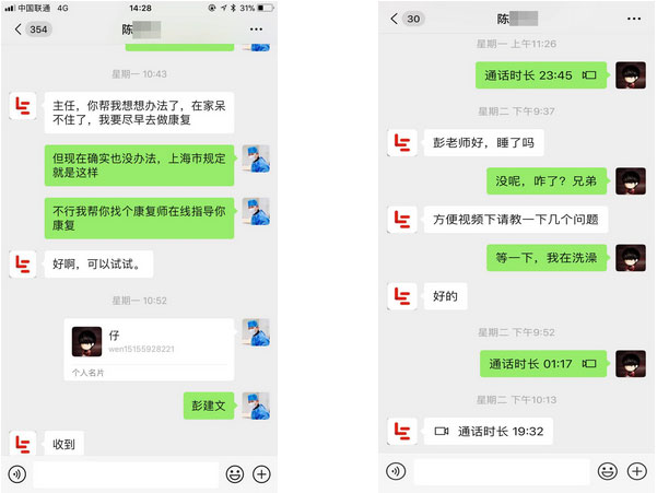 “主任,你帮我想想办法,在家待不住了,我要尽早去做康复。”3月初,张琪博士的微信收到了患者的求助信息。他一边安抚焦虑的患者,一边马上跟病区康复组长彭建文取得联系。工作本来就很繁忙的彭建文二话不说,利用下班休息时间,通过微信为患者“直播”了一些简单易操作的康复锻炼动作要领,帮患者解决了烦恼。