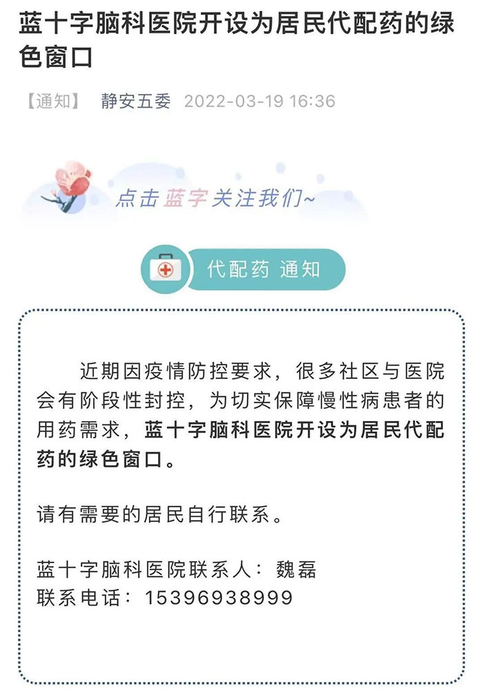 处于阶段性封控的小区居民,如有慢病药品需求,可请居委会与蓝十字脑科医院联系,医院将会第一时间为代配药的志愿者开通绿色通道,守护好居民的健康。