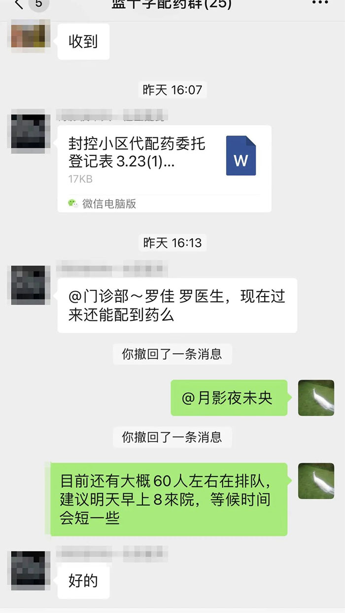 从代配药服务微信群建立以来,“蓝小爱”团队每天都要接听40多个电话、回复数百条微信消息,协助居委志愿人员完成数百份配药清单。“谢谢罗主任,幸亏有你们这边帮忙指引,才能更快地配到药。”居委志愿者每次临走前,都忍不住一再表达谢意。