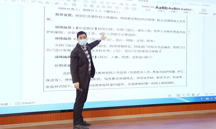 项耀钧院长对医院封闭管理期间,物资保障与交接、患者救治、人员安置等各方面工作进行了详细指导和工作布置。他指出,推演是完善应急预案、强化预案可操作性、提高协同作战能力的重要途径。全院上下要以推演为契机,及时总结经验,认真查找不足,加快补齐短板,切实做到有急能应、应对有力,各司其职、精准落实防控任务。