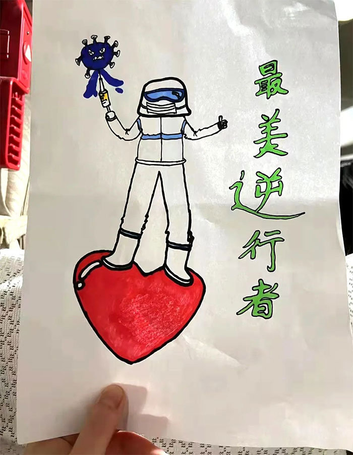今天收到了一份暖心的礼物——一幅手绘画。上面画了一个“大白”,踩在一颗大大的红心上,右手举着一个扎着病毒的大针筒,右边写着一行绿色的大字——“最美逆行者”。小朋友告诉我,画上这个“大白”就是我。其实,我心里知道,他心中的“大白”应该并不只是我,而是所有穿着“大白装”的人,只是碰巧让我遇上了。