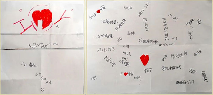 还记得3月11日那天,万科双语学校的采样小分队,收到了六年级3班的小朋友们亲手制作的“特殊礼物”。一件不一样的防护服,上面用水笔,密密麻麻地写满了祝福词。“谢谢你们,辛苦了!爱你们!”、“你们是最美的!”、“感谢你们舍身为人的帮助!”、“愿疫情早日过去!”……他们用这种方式,抒发着对于抗疫的情感与理解,表达他们对医护人员的感激和支持。小小的心灵,以独特的视角,审视着这个世界。在他们眼中,“大白”们无所不能,无所不会。他们就是这个世界的英雄!