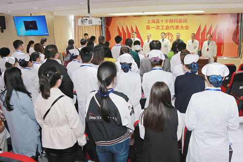 大会开始,全体起立奏国歌。随后由医院党支部书记朱敏宣读七宝镇总工会闵七工组【2017】18号文件《关于同意上海蓝十字脑科医院成立工会筹备小组的批复》。