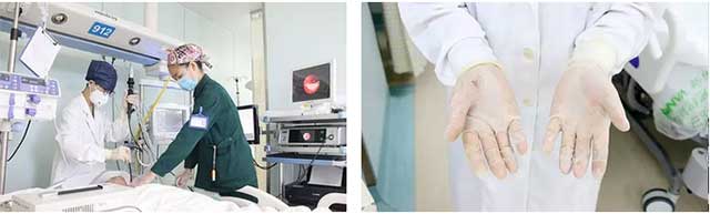 ▲ 纤支镜治疗后,李鲁萍的手套汗湿了