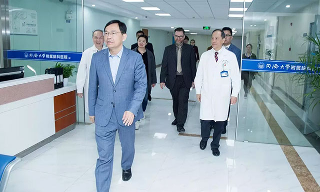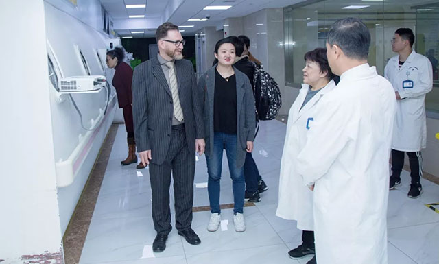 上午10点半,德国柏林大学附属夏里特(Charité)医院国际合作主管Lutz Steiner在同济大学医学院国际医学教育与合作办公室主任沈慧霞、同济大学医学院德国事务外事专员寇琦的陪同下莅临上海蓝十字脑科医院,先后参观了医院手术室、重症监护病区、神经内科7A病区、高压氧科、影像科、DSA介入科及放疗科,对医院的设施设备作重点了解。