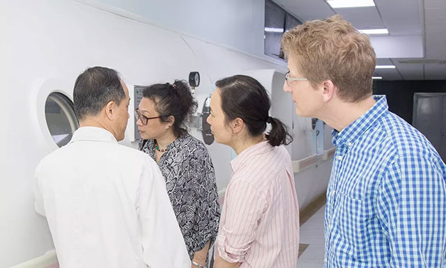 在公司总裁助理王小红和项耀钧院长的陪同下,邹红雁教授一行先后参观了医院手术室、重症监护病区、神经内科7B病区、高压氧科、影像科、DSA介入科及放疗科,对医院的特色科室和设施设备作重点了解。