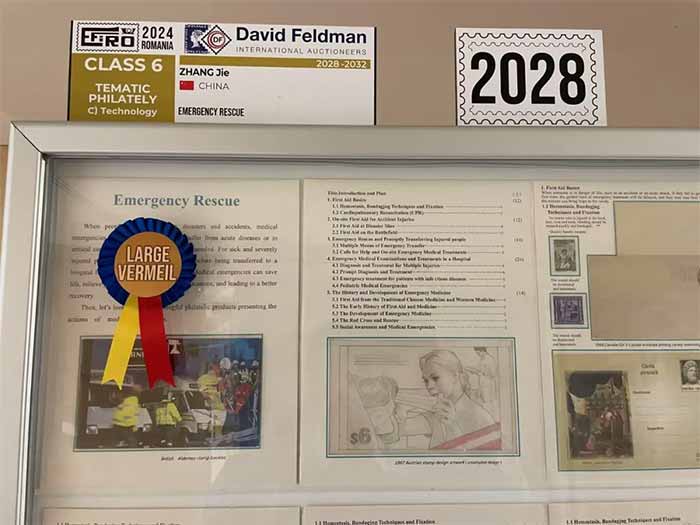 ▲ 张杰主任的专题邮集《紧急救人》在2024年罗马尼亚世界邮展荣获大镀金奖(88分)
