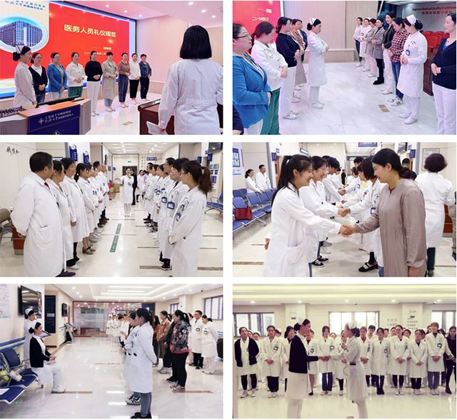 与此同时,为了进一步深化优质服务内涵,营造健康向上的人文环境,不断提高全院职工的整体素质,提升医院的形象,从4月2日至4月19日,全院开展了礼仪规范三轮培训、两轮考核,从医护及行政后勤职工职业形象要求、着装原则、仪态规范,以及站姿、坐姿、走姿、蹲姿、护理操作礼仪、交接班礼仪、电话礼仪、电梯礼仪、交谈礼仪等内容进行了深入浅出的讲解示范及训练,优美标准的动作、有趣的互动使得现场气氛热烈,掌声不断。