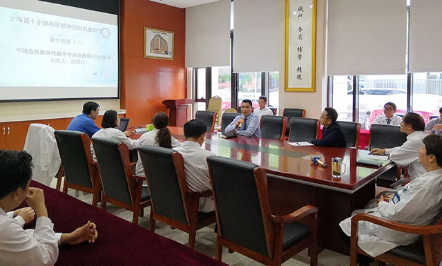 为加强学术交流,提升诊疗水平,4月25日下午,上海蓝十字脑科医院神经内科教研室组织开展了教学讲课活动,神经内科学科带头人、蓝十字神经内科教研室主任孙晓江就《中国急性缺血性脑卒中诊治指南2018》(下称“指南”)进行了精彩解读,潘耀良副院长及全院内科临床医生参加交流。