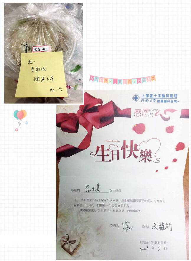 李士其教授属龙,为工作早已经忘了5月份的生日已临近。但是,医院领导及同事们为李士其教授精心准备了生日祝福。一大早,朱敏总经理、项耀钧院长代表医院专门送上李士其教授的生日蛋糕和贺卡;神经外科6B病区主任潘仁龙携科室全体同仁也为李教授精心准备了生日蛋糕、咖啡、甜品等;客服部主任罗佳为李教授准备了长寿面,大家陪伴李教授度过了一个简单而温馨的生日。