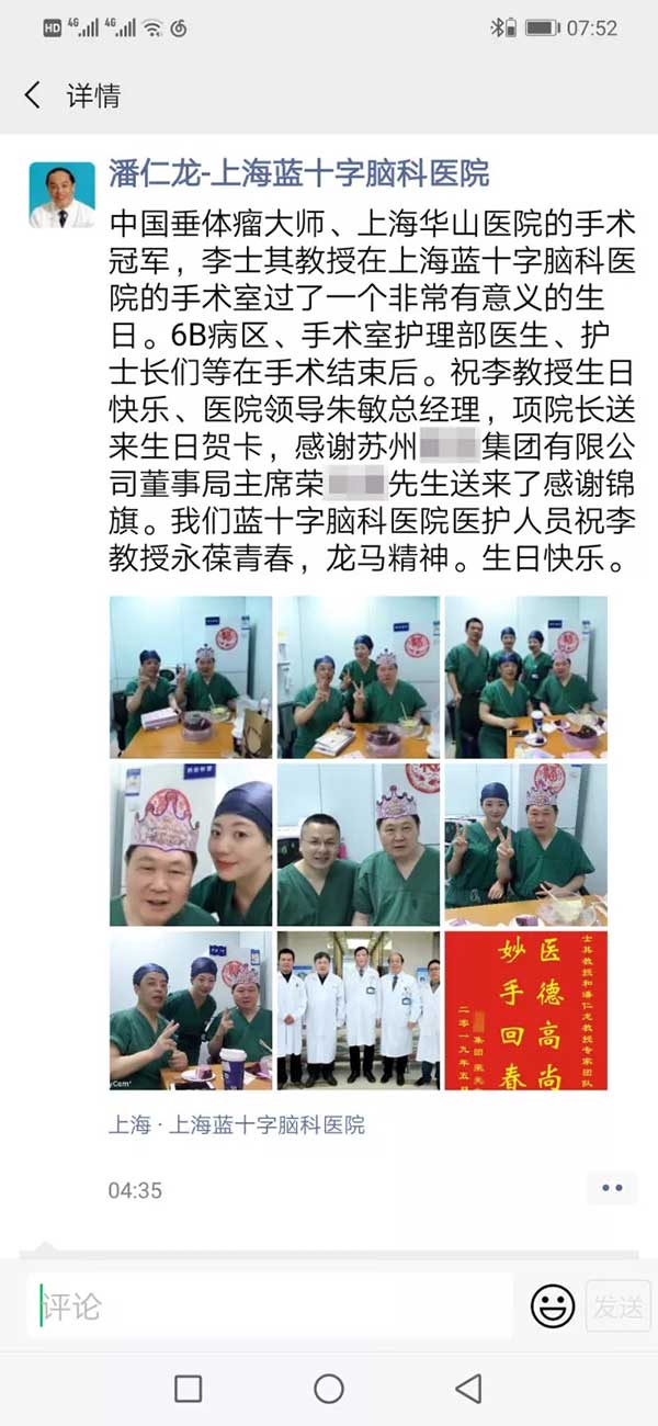 5月7日,上海蓝十字脑科医院神经外科李士其教授刚完成一台垂体瘤手术,走出手术室时,同事们围拢上来送上生日祝福,令李教授倍感意外和惊喜。