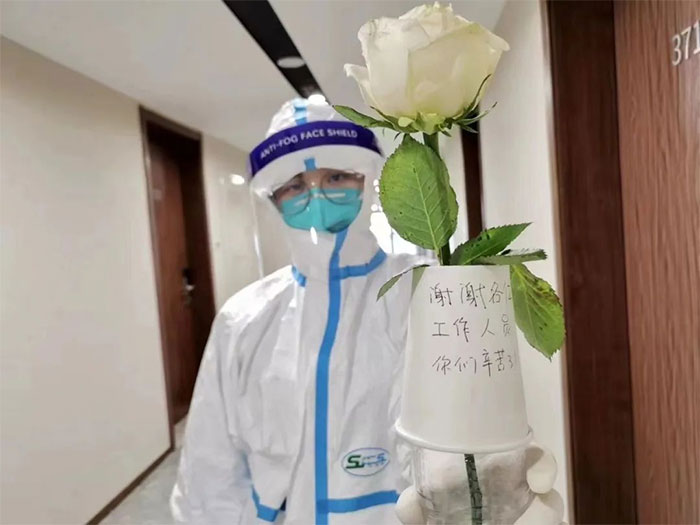 自疫情发生以来,张秀娟带领护理团队坚守在疫情防控一线,从病区规划、布局、布置、人员安排、物资准备到科室培训、三级防护等环节做好了充分的应战准备。作为护士长,张秀娟以身作则,包揽全科餐食发放及患者、家属的核酸检测等。每日奋战一线,张秀娟不幸感染了病毒。在方舱隔离期间,她“人不在,心却在”,时刻心系她的每一个“孩子”,每日多次打电话来科室询问情况,负责科室总调度,并每晚固定时间与科室护士视频通话,安抚她们的情绪,缓解她们的压力,在隔离期满康复后第一时间返回科室。她的坚守,给医护人员和患者吃下了定心丸,给她们注入了信心和动力。