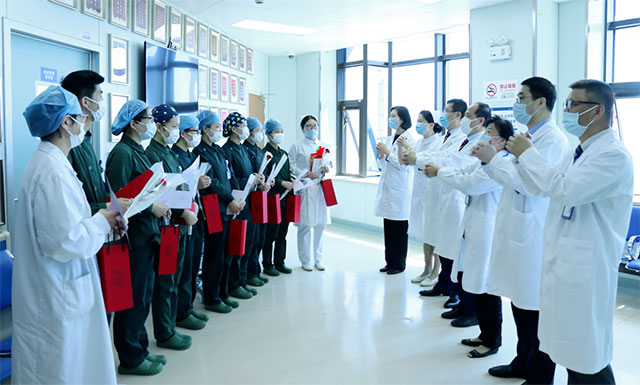 院领导们首先来到神经外科ICU慰问护理人员。在ICU门口,双方面对面站立。院领导双手作揖,齐声祝福,“祝大家节日快乐”;另一面,护士们鞠躬齐声致谢,“谢谢”二字发自肺腑,好感动啊。